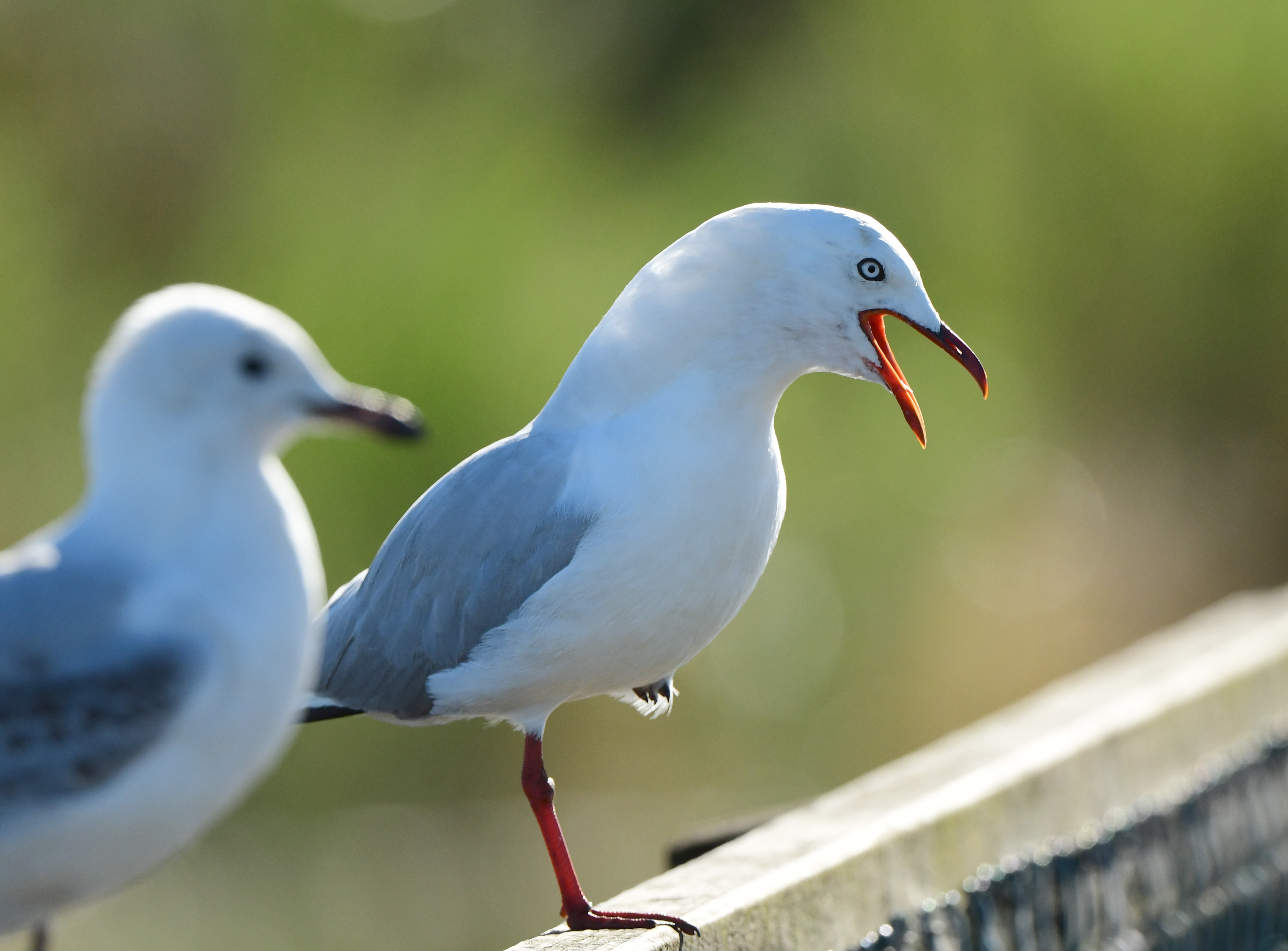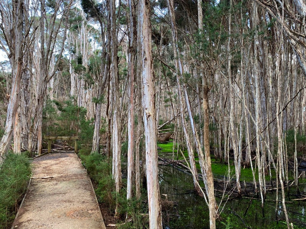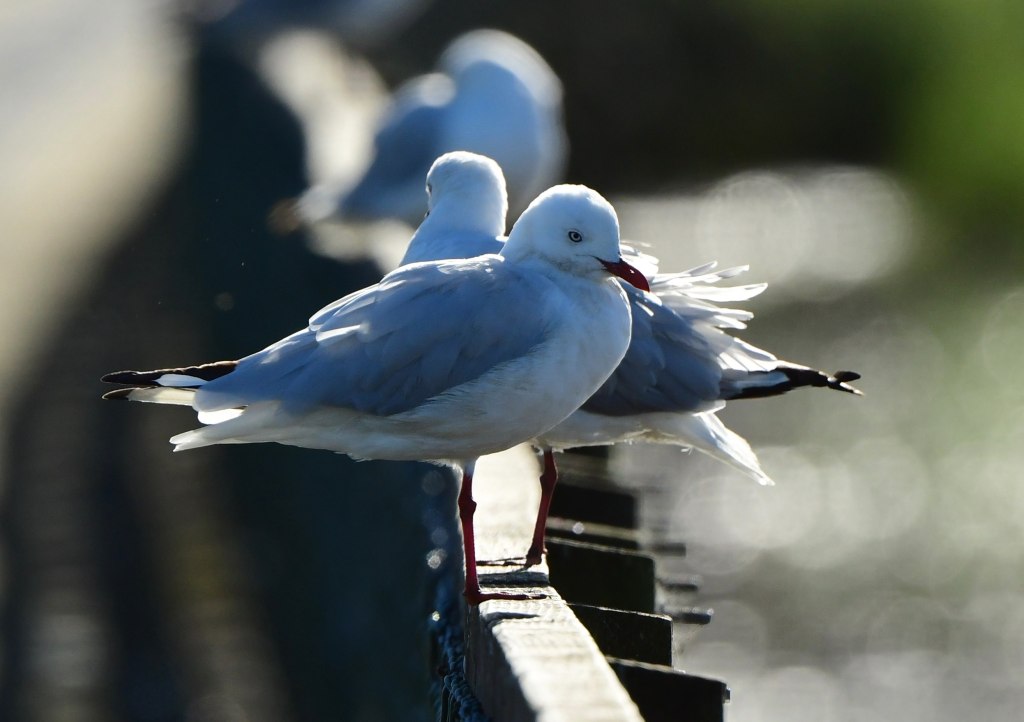 Partway along the boardwalk there was a stretch lined on both sides with Silver Gulls; this part had the look of an intimidating gauntlet, and it was all but guaranteed the gulls would scare and take off as we passed through. Which they did – indignantly and with much squawking.
