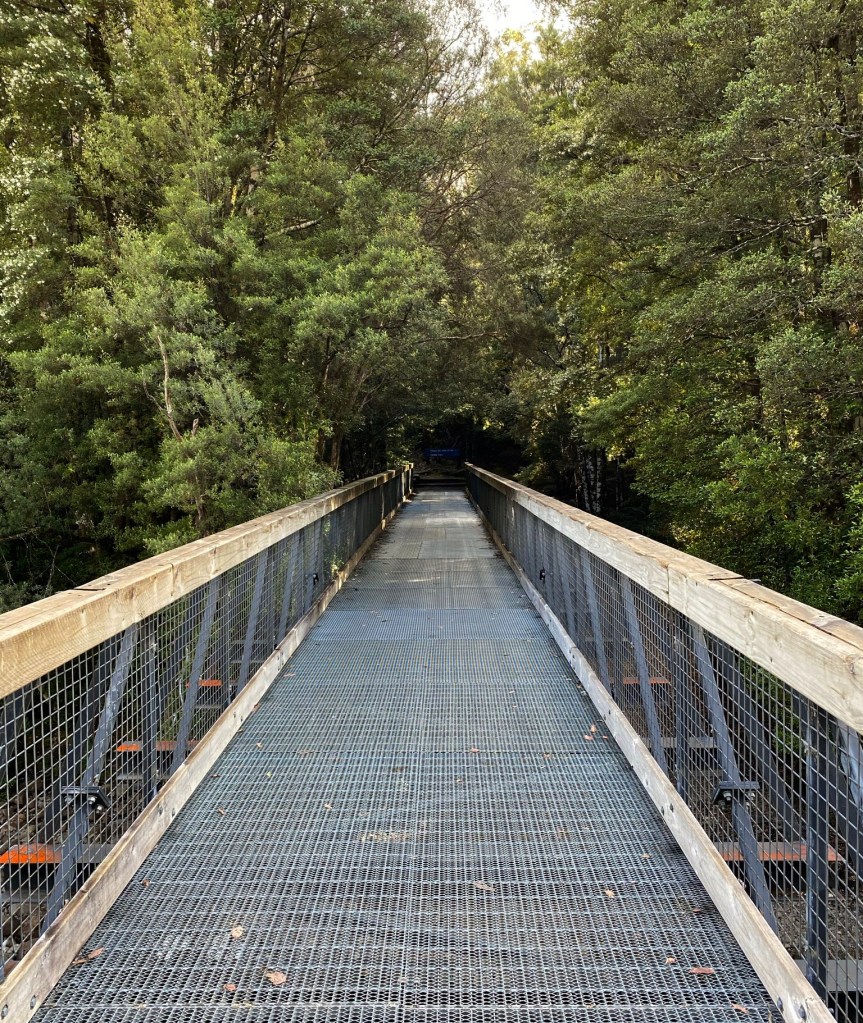We saw another Grey Fantail and a Yellow-Throated Honeyeater and then the walk passed through some interesting bushland with understorey of ferns, occasionally breaking out into tussocky fields. These looked delightful in the re-emerging morning sun and were protected from marauding hiking boots by a sturdy boardwalk.