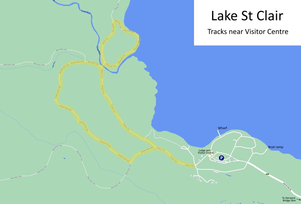 We enjoyed our walk around the tracks close to Lake St Clair visitor centre. Admittedly partly this was due to the sunshine which teased us initially and then came out in full force for the latter part of our time there. Outside the visitor centre grounds there were virtually no other people, just serene nature and atmospheric forest to enjoy at leisure. The tracks are well-maintained and marked with clear colour-coded signposts so there’s little danger of getting lost. You can get a little taste of the Overland Track, and a couple more trails give access to Mount Rufous (to the west) and further lakeside exploration as well. We were coming off a poor birding expedition at Cradle Mountain where we circumnavigated Dove Lake and saw just one bird the entire time (a cormorant in the lake), so even though we didn’t see too many birds at Lake St Clair, every sighting was appreciated! And the 13 species we saw were a good mix of larger birds (Currawong and Cuckooshrike) and smaller (thornbills and Welcome Swallows) and of course several honeyeaters.