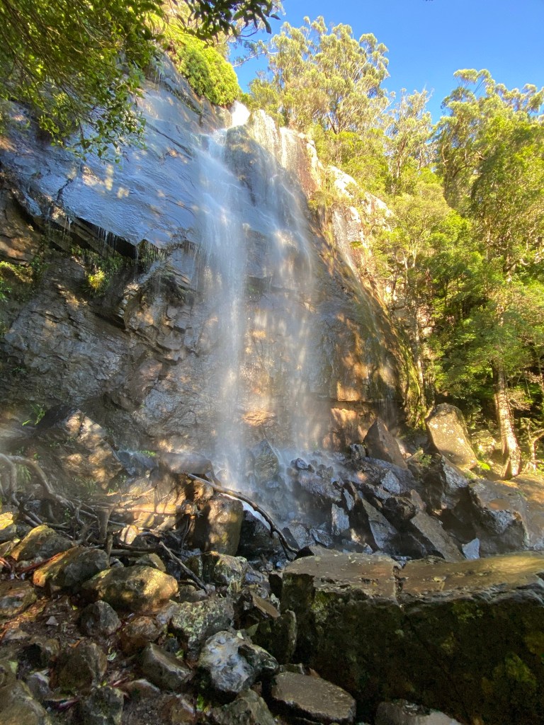 The waterfall at the southern edge of the circuit – named Twin Falls – soon came into view and looked very pretty. Again you can (actually, you must if you want to continue along the track) pass behind it, giving ridiculously photogenic views of the forest through the veils of cascading water.