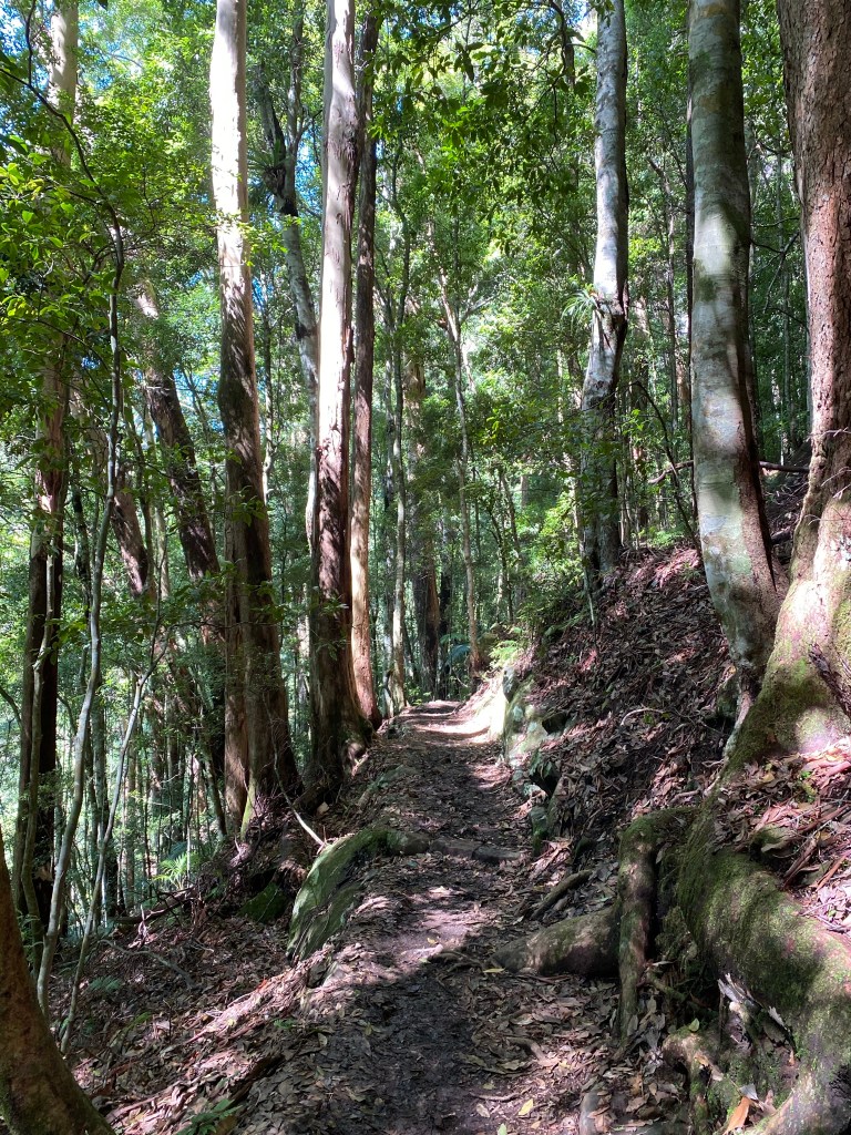 As we descended we could see along the sun-lit cliff-line, though soon after the dense forest created some serious shade and the trail became very, very dark. Birding was tough in these conditions with most photos being too blurry for use – notable subjects here being Yellow-Throated Scrubwren and a pair of squabbling Rufous Fantails. A Grey Shrikethrush provided the most substantial photographic encounter but I was also hoping to get closer to one of the Crimson Rosellas I was glimpsing.