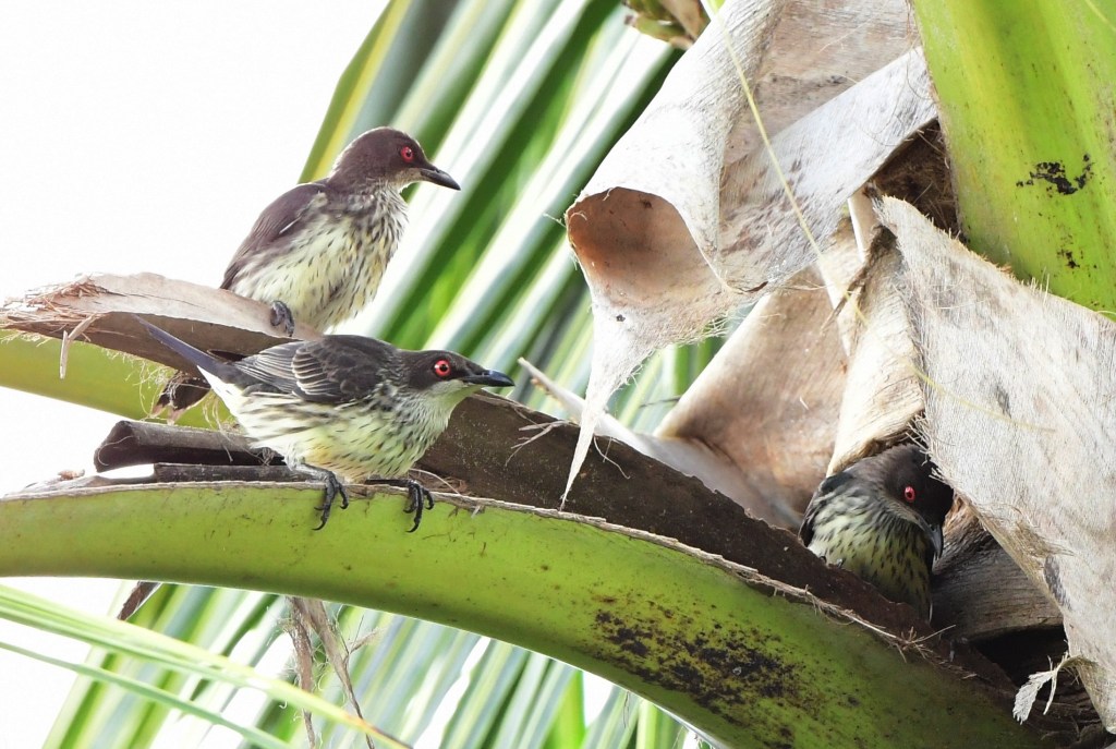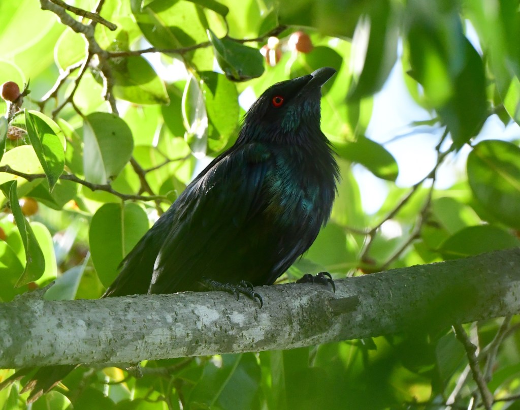 The other bird that one notices quite readily swarming in numbers at dusk are the Metallic Starlings. These birds are found only in North Queensland, New Guinea and some nearby islands. Immature birds – such as the ones on the left below – have pale breasts with some streaking, while adults are a beautiful iridescent black colour (giving them their other name, Shining Starlings). They also have startling red eyes.