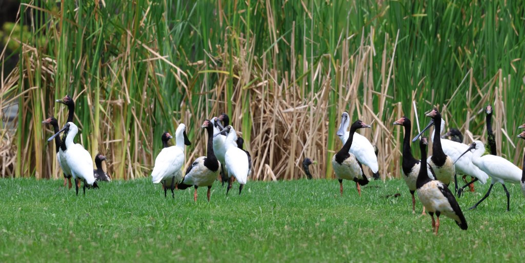 Magpie Geese fluctuate in numbers, sometimes reaching nearly 90 birds (in Oct 2022). Like the Spoonbills and Egrets, they tend to prefer the “other side” of the lake – that is, opposite the car park side.