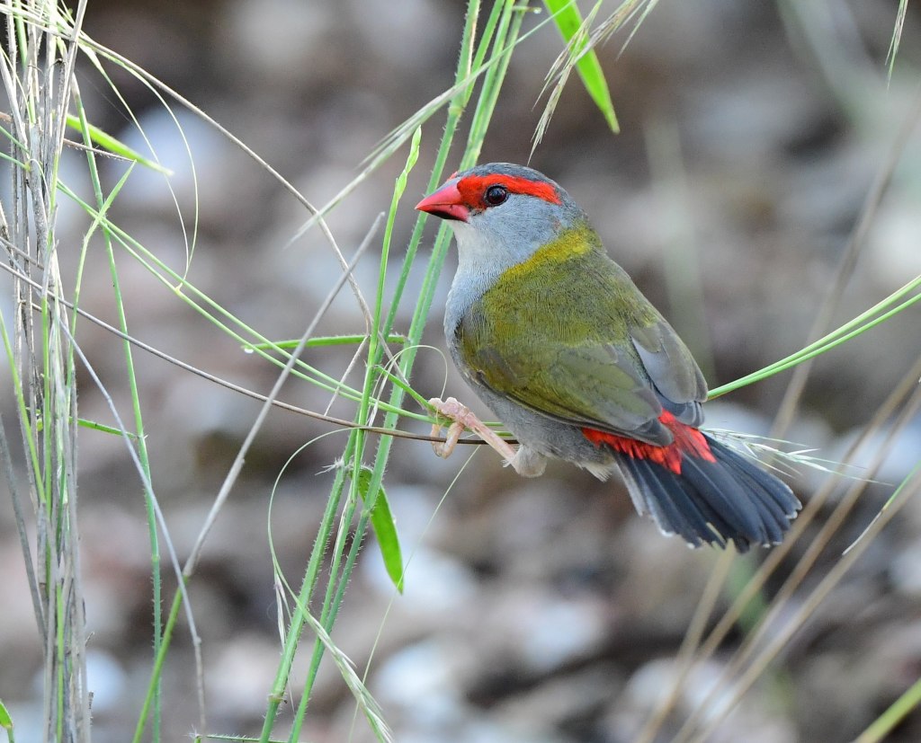 I lingered around the creek area, not seeing anything much except a Rainbow Bee-Eater briefly far away, so decided to work my way back up GT Break again. I was rewarded with the sight of a Red-Browed Finch nest collecting – it was compulsively returning to the same spot to gather material, passing across the path and pausing alongside it to grab grass stalks. It did this three or four times, and became rather unbothered by my presence. These are times when it’s easy to like the birding hobby!