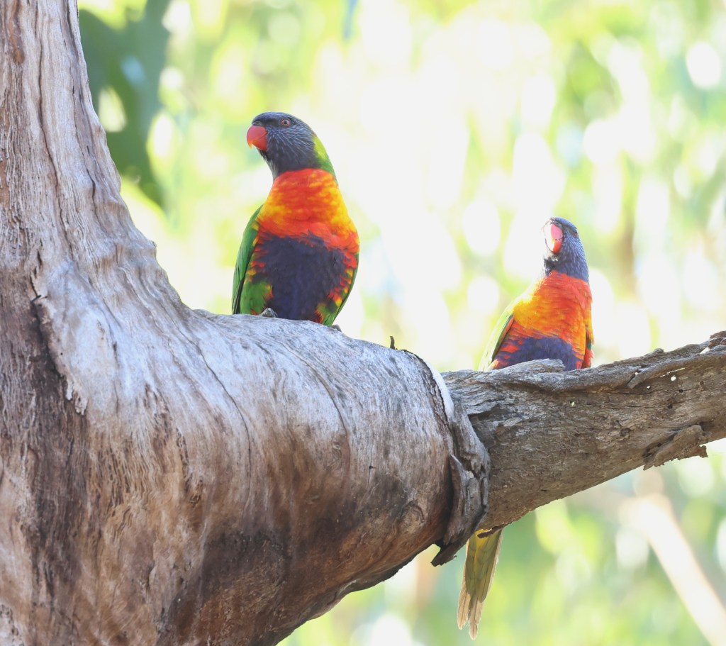 On my revisit in Mar 2023 a couple of Sulphur-Crested Cockatoos thought they were the stars of the show. They come down to drink on the stony bare ground at the water’s edge, and nest in hollows in the surrounding gum trees. A Rainbow Lorikeet – perhaps ousted by one of the cockatoos – hung around very close by.