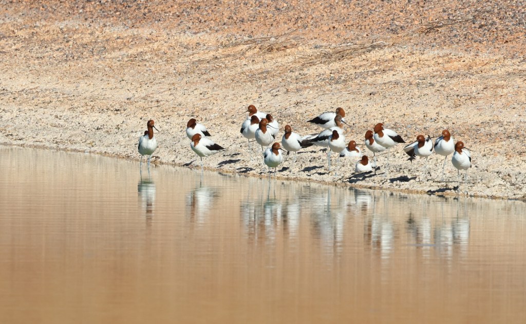 This is probably a Little Crow. But, it may not be. But it probably is.There are 215 Little Crows (wheeling above the Alice Springs Sewage Ponds) in this picture. I know, because I counted ’em!Speaking of the Alice Springs Sewage Ponds, here we found an Australasian Grebe and a Hoary-Headed Grebe, conveniently posed for us in one picture!Red-Necked Avocets, also hanging out at the Sewage Ponds