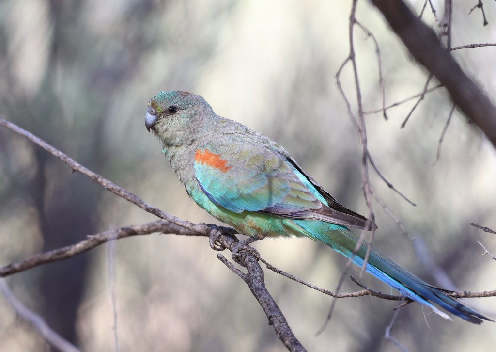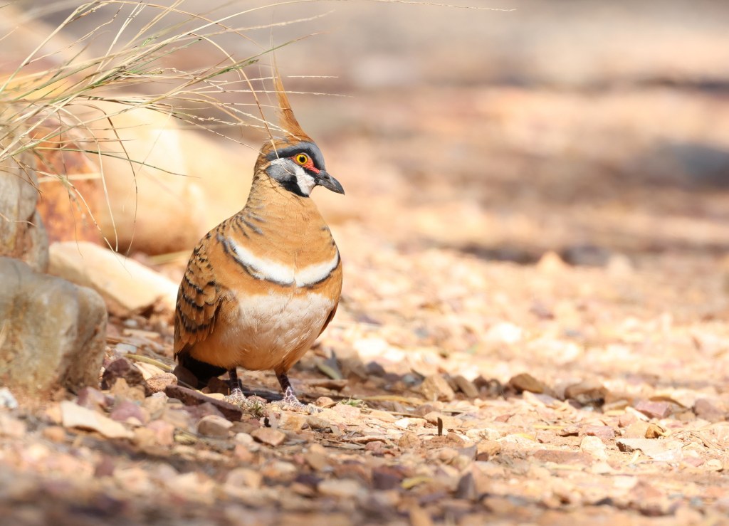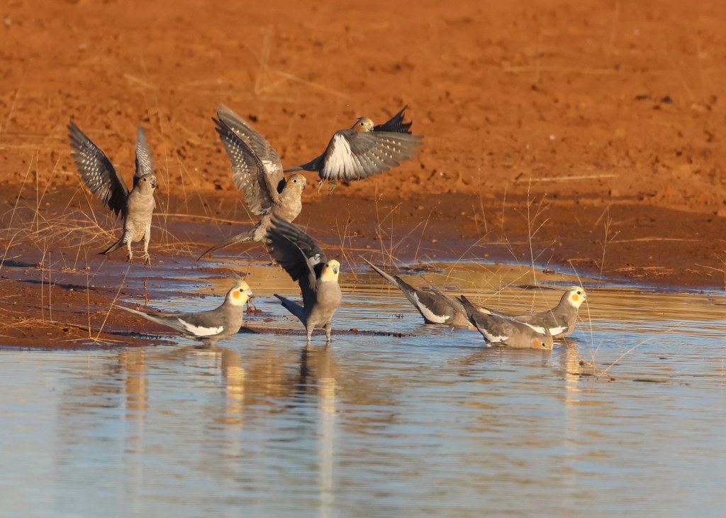Actual example of gap and waterholeWild Budgies in the… erm… wild.More Budgies… and a couple of Black-Faced Woodswallows… and a Crested Bellbird! A popular tree, indeed.Cinnamon Quail-Thrush. It is never easy to see a Quail-Thrush, but we got a reasonably decent (though far-off) look at a pair of these. They blend in so well with the red rocks and dirt, that it’s doubtful we would have seen them if they remained still.Splendid Fairywren female. Has the same lores (colour between bill and eye) as female Superb Fairywrens, but more vibrant tail feathers.After much searching, finally a Dusky Grasswren! Possibly my favourite bird of the trip.A close-up with a Red-Capped Robin was the order of the day at the otherwise-fairly-quiet Ochre PitsEpic gum trees along a dry river bed… a common sight when birding in these partsPink Cockatoo playfully chewing and picking at bark – at Redbank Waterhole in Owen Springs National ParkThe dramatic landscape of Ormiston Gorge. There are worse places to go birding…Spinifex Pigeons basically scurry around your feet at the little café at Ormiston Gorge, and sometimes they even stop long enough to have their photo takenThe teensy Weebill is Australia’s smallest bird, but is rather widespread!Lizards enjoying a sunny rock at Ormiston Gorge.The humble Mulga Parrot, with a bluey-green sheen reminiscent of a Red-Rumped ParrotCockatiels coming down to drink at a bore waterhole