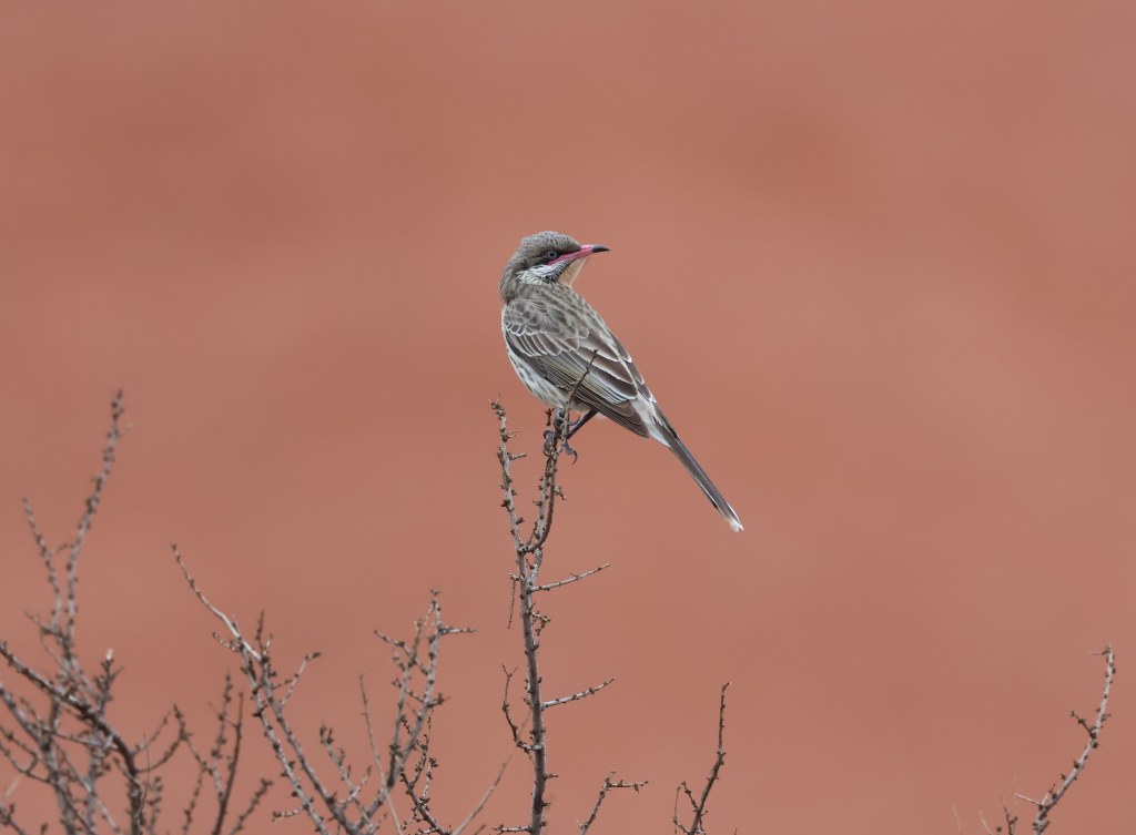 The Red Centre is truly the middle-of-it-all of Outback Australia and even though it’s dry (some would say, arid), there’s still plenty to see what with arresting rocky landscapes, vast (though usually dry) river systems, never-ending landscapes of Desert Oak and Spinifex, and of course that rock. We had some great bird encounters with a variety of species: our meetings with Dusky Grasswren, Redthroat, Crested Bellbird, Mulga Parrot and Chiming Wedgebill will linger long in the memory. We can definitely see ourselves returning to spend some time walking those gorgeous gorge trails, perhaps at a leisurely pace, keeping an eye or two out for those few birds we missed out on this time.