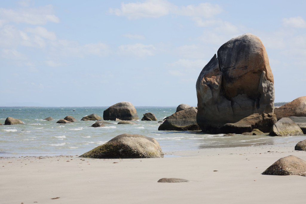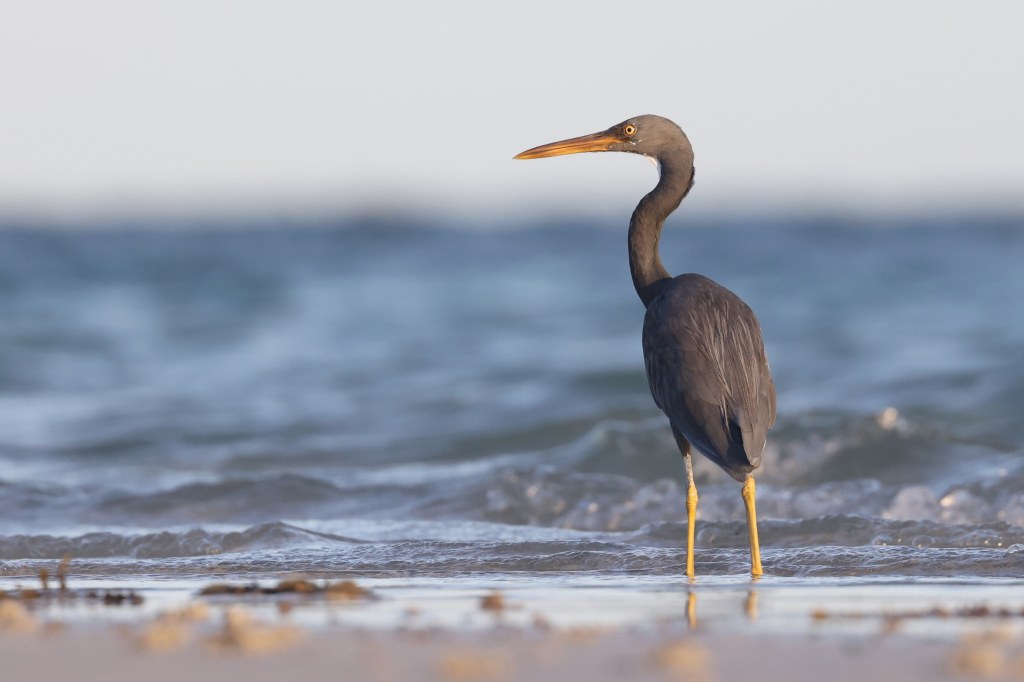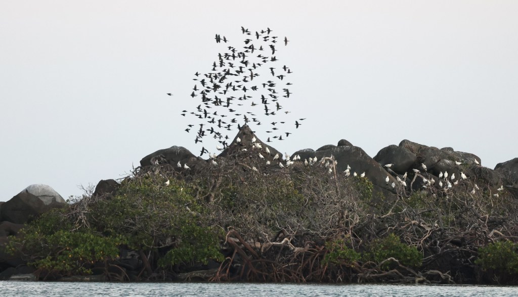 The much-photographed rocks of Quintell Beach; Common Sandpipers and Pacific Golden Plovers foraged nearby.Black Noddies fishing in a group offshore from Portland RoadsIt did not seem likely or real that you could actually see frigatebirds (like this Great Frigatebird) circling like raptors over the coast line, but we did! At Portland Roads.A dark-morph Eastern Reef Egret at Chilli Beach. It was hunting for fish in the surf!Metallic Starlings swarming in the evening over a rocky island across from Chilli Beach. They kept coming in small groups and our total count reached nearly 2400, far eclipsing the 200+ Torresian Imperial-Pigeons which also roost there.