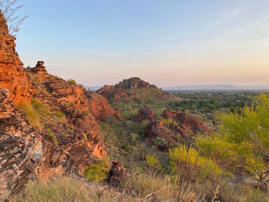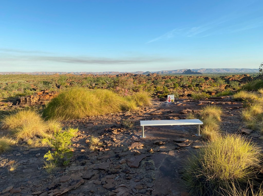 There are a couple of short walks from the car park. The Demboong Banan Trail is just 0.6km but climbs steeply (via cut rock steps and metal stairs) up to a lookout that gives a great view across Kununurra – a top spot for watching an outback sunset.
