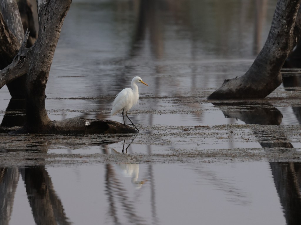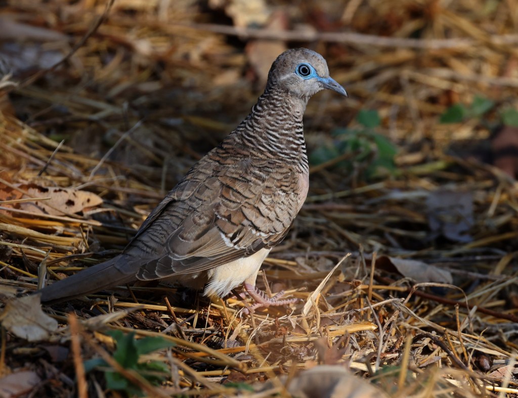 Here we found Golden-Headed Cisticola, several White-Faced Herons in the long grasses by the canal, and quite a few dozen doves foraging on the dirt road (until they all exploded up into a tree at our approach…). At first blush it seemed most of these birds were Diamond Doves, but we eventually counted almost the same number (35) of Bar-Shouldered Doves too. There were plenty of Magpie-Larks, and a flock of over a dozen Yellow White-Eye.
