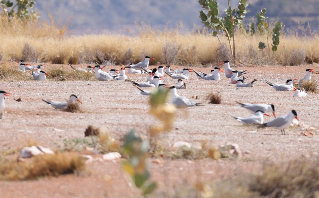 In all we counted at least 20 Yellow Chats. Brown Songlark and Singing Bushlark featured as we left the water and walked through the grassy semi-formed path across the island, eventually coming back around to the east side where the Caspian Terns (we estimated 280!) have their nesting colony.