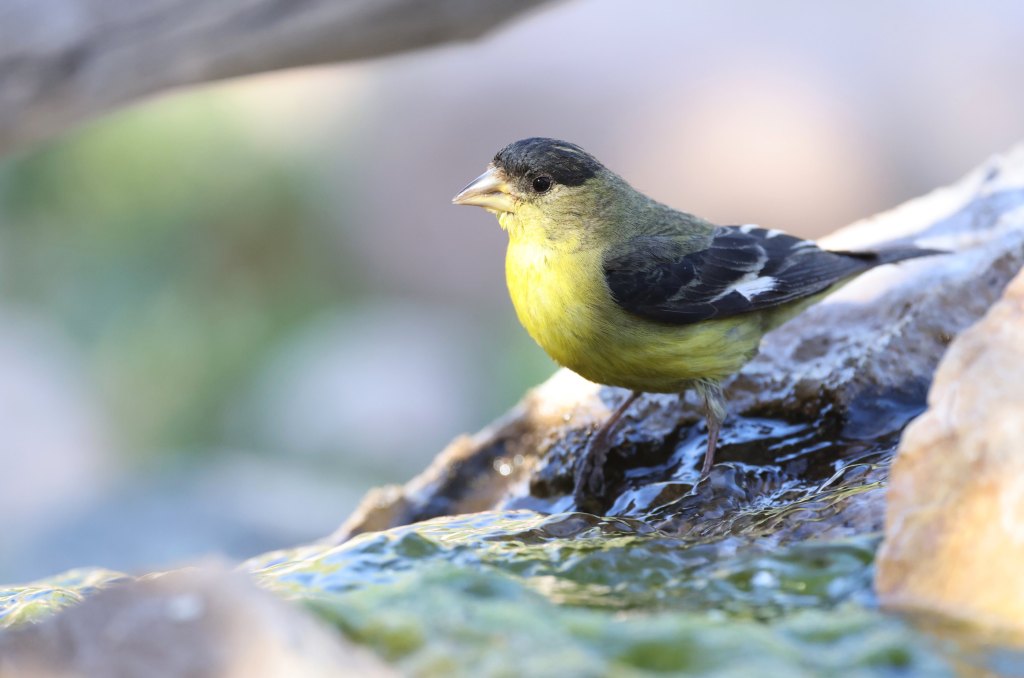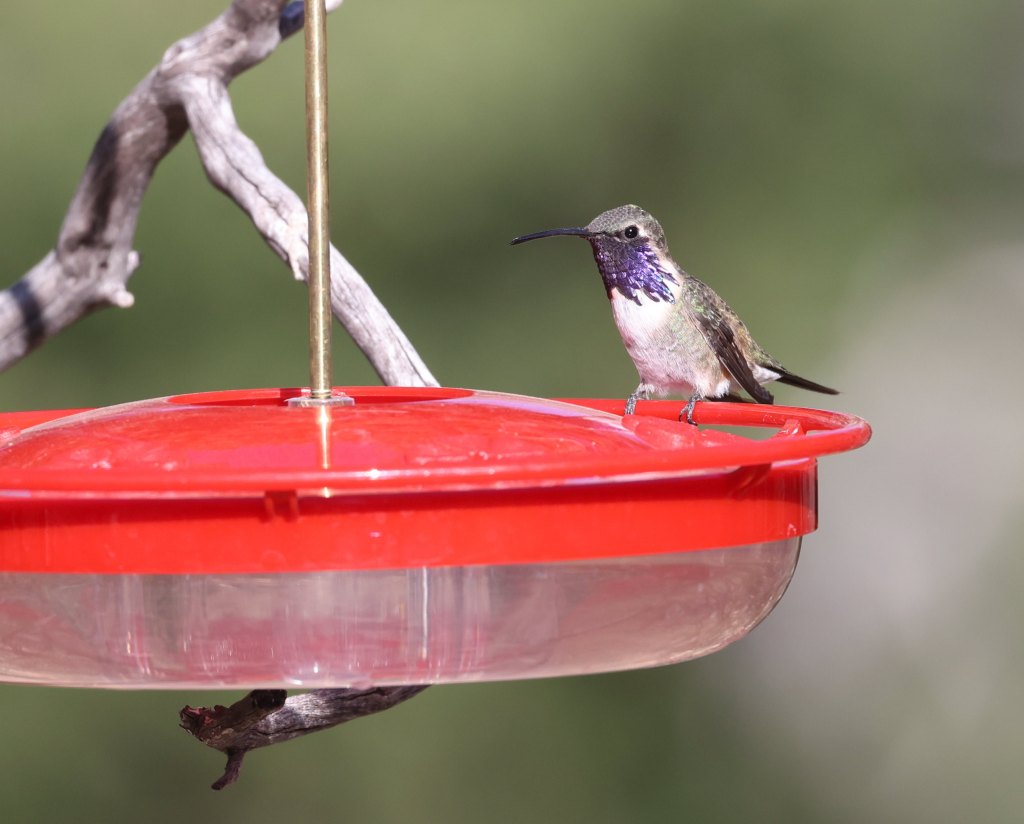 The striking Lark Sparrow about to head to ground to scarf up whatever free seeds it can findThis is my favourite photo of the reasonably common Mexican Jay – because I like the way the background colours echo the colouring of the birdA Lucifer Hummingbird created a bit of a stir and lots of camera clicks when it flew into one of the feedersLesser Goldfinch about to dip into one of the man-made water flows at Ash Canyon Bird SanctuaryThe Lazuli Bunting comes in different shades and vibrancies of blue, and we saw a bunch of ’em at the sanctuary