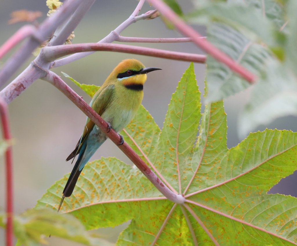 There is one big caveat to all this, however: you often can’t get close to the bee-eaters without trampling through the fringing unmowed grass line, and depending on growth levels, this might mean you can’t (or at least, shouldn’t) smash your way a few feet through potentially thick, dense growth – including castor oil plants (Ricinus communis) with their cloying orange goo. Potentially this could damage the sandy tops of the riverbanks, so use caution and keep good birding ethics in mind (also, maybe, snakes…!).