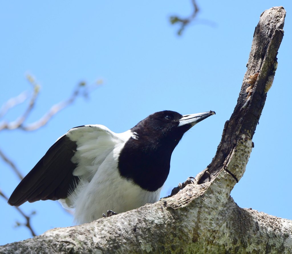 A Pied Butcherbird was something of the star of the show for this visit. Butcherbirds get their name from their habit of impaling captured prey on a tree fork or similar crevice, behaviour which I admit I’ve hardly ever seen them actually do! But on this day a butcherbird wedged a fat grub into a branch and proceeded to use that as a dinner plate. It was rather interesting to watch.