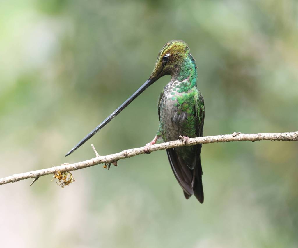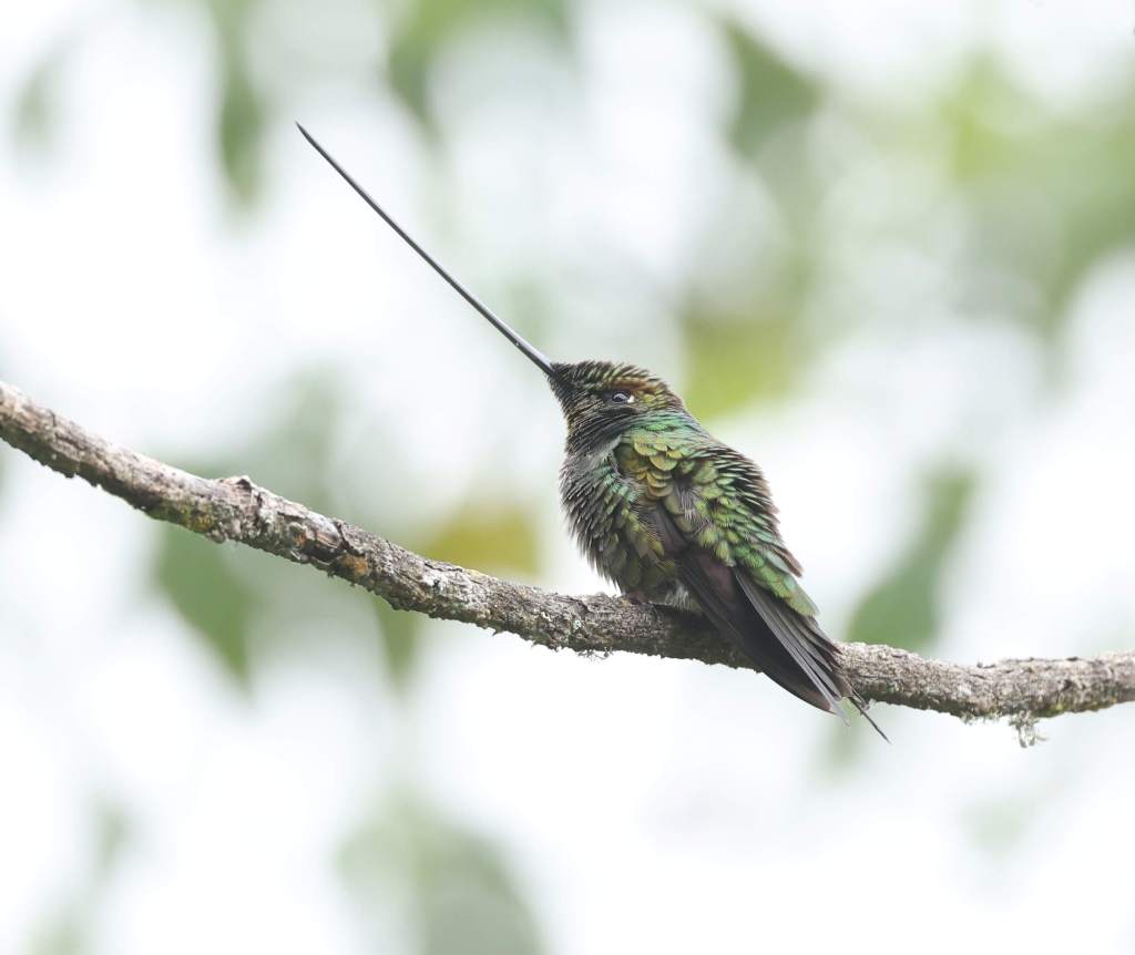 For sure the hummer that everyone wants to see – with good reason – is the incredible Sword-Billed Hummingbird. We saw it on our two visits, though it took a little while for it to turn up both times (like, a good 40 minutes, keeping a beady-eye lookout…) It is just as arresting and kindof unbelievable-looking in real life as photos make it seem, and we drank in good looks at the bird for the minute or so it stayed around the feeders.