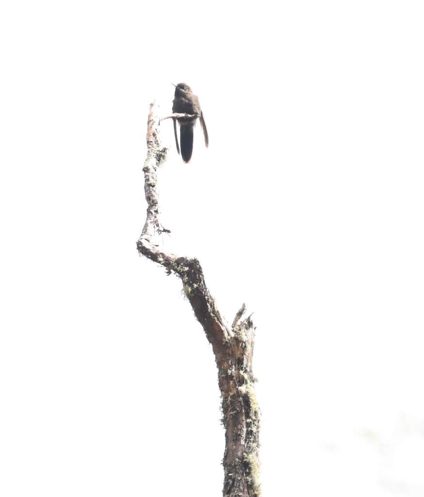 Due to the foggy conditions and occasional vehicle (including buses and trucks) roaring past, birding on this northern side was a little tricky and more suited to spotting birds further away than savouring close-up photographic encounters, though we did get lucky with a Sword-Billed Hummingbird lazily lounging out in the open, and a Sapphire-Vented Puffleg flitting from flower to flower. It was also on-brand for Red-Crested Cotinga to sit still near the top of an exposed tree branch (thanks, Cotinga!) rather than lurk warily in the foliage (like, ahem, Inca Wren and several others…)