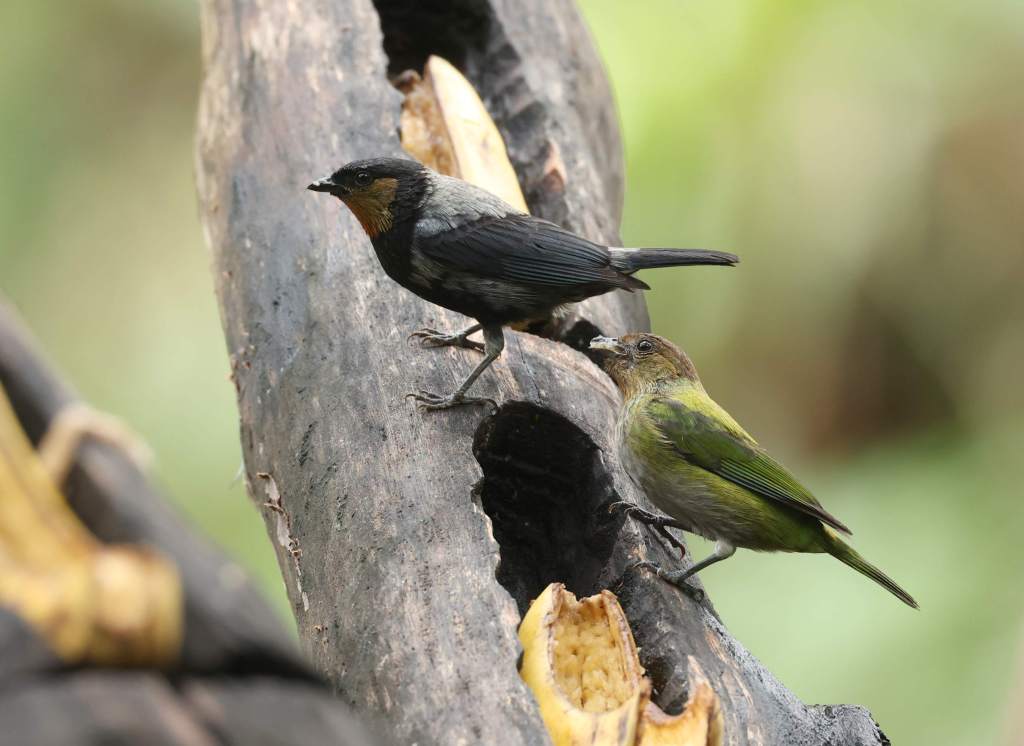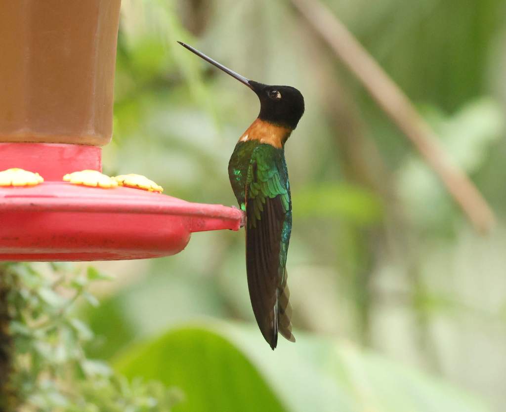They have a few hummingbird feeders and fruit feeders. The dominant hummer was the plucky Chestnut-Breasted Coronet, which fiercely guarded their favourite feeders, while Gould’s Inca, Sparkling Violetear, Bronzy Inca and White-Bellied Hummingbird were also around – some of them hard to spot due to being very high up in the flowering canopies.