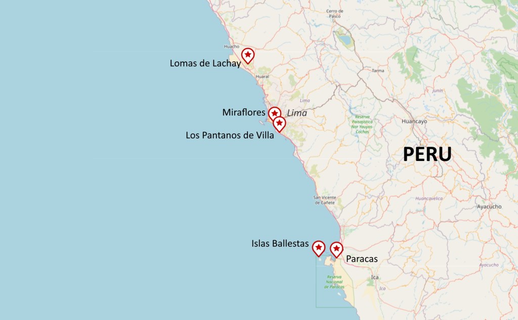This blog post covers the spots on the map: birding within the city of Lima itself (surprisingly enjoyable), Paracas and the Islas Ballestas to the south (big drawcard of Humboldt Penguins), and Lomas de Lachay to the north (microclimate with some interesting species).