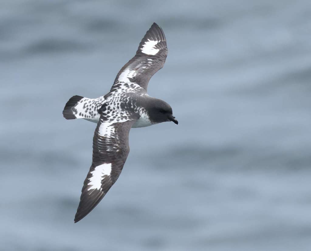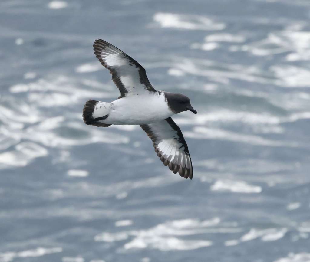 Time spent on the deck was often rewarded with seabird sightings when the ship was plowing across the open ocean. There were various fly-bys, and often a few birds trailing the boat, probably enticed by what might be stirred up in the wake (or hoping for some waste to be thrown over). Cape Petrel, also called Pintado Petrel (“painted petrel” in Spanish), were regulars, sometimes numbering in the dozens, and easily identified with their amazing patterned upper parts.
