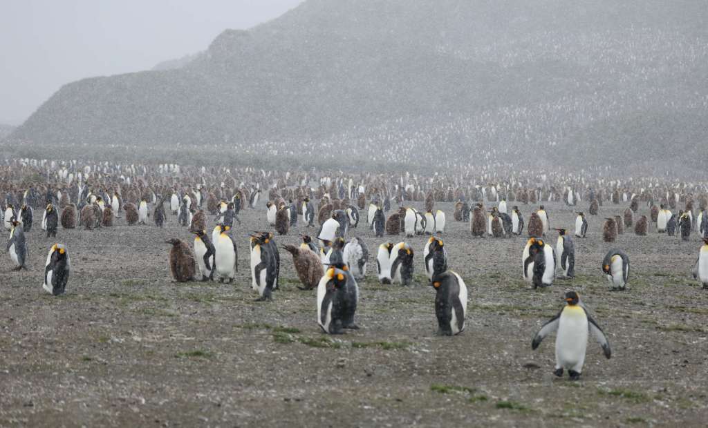 Here was our first taste of gigantic King Penguin colonies: at Right Whale Bay (no landing possible due to evidence of Avian Flu), Salisbury Plain (our first landing) and Fortuna Bay (our second). Salisbury Plain hosts the second-largest King Penguin colony in South Georgia with approximately 250,000 birds, with 60,000 being breeding pairs and their chicks. It’s quite a sight.