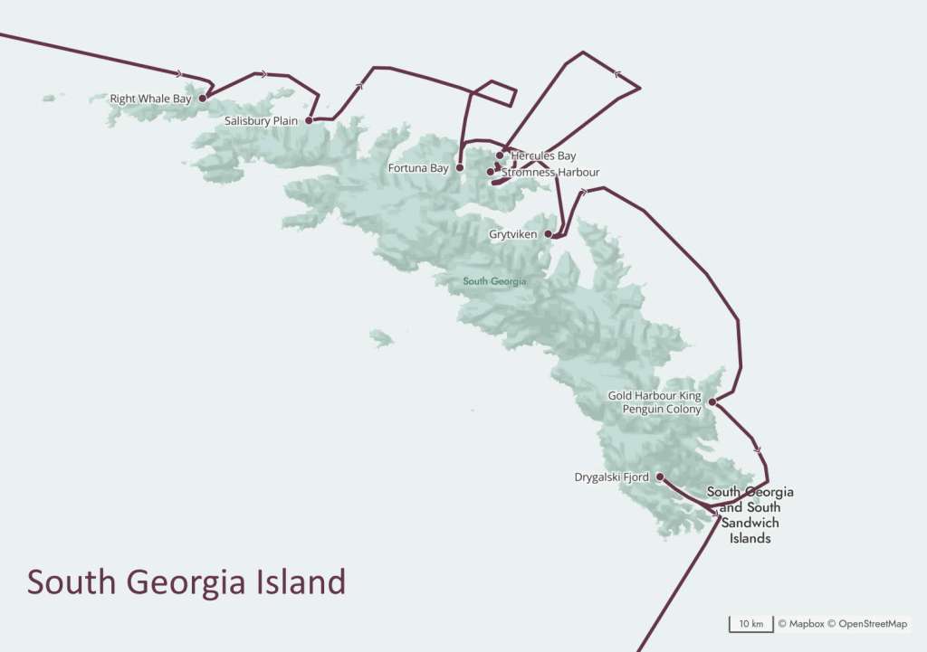 The vast majority of stops on South Georgia Island are made to the various bays and inlets on the west and north-west side of the island.