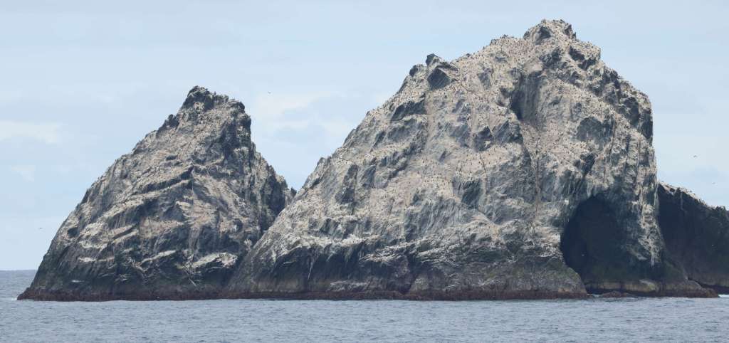 The first hint that you’re going to see huge numbers of birds comes when Shag Rocks slides into view, a few hundred kilometres west of South Georgia. Each dark dot in the photo below is an Imperial Cormorant. We reckoned 810, which is probably a wild under-estimate: in October 2025 someone in an eBird checklist counted 11,000. It’s a lot of birds, on a modest set of pointy rocks.