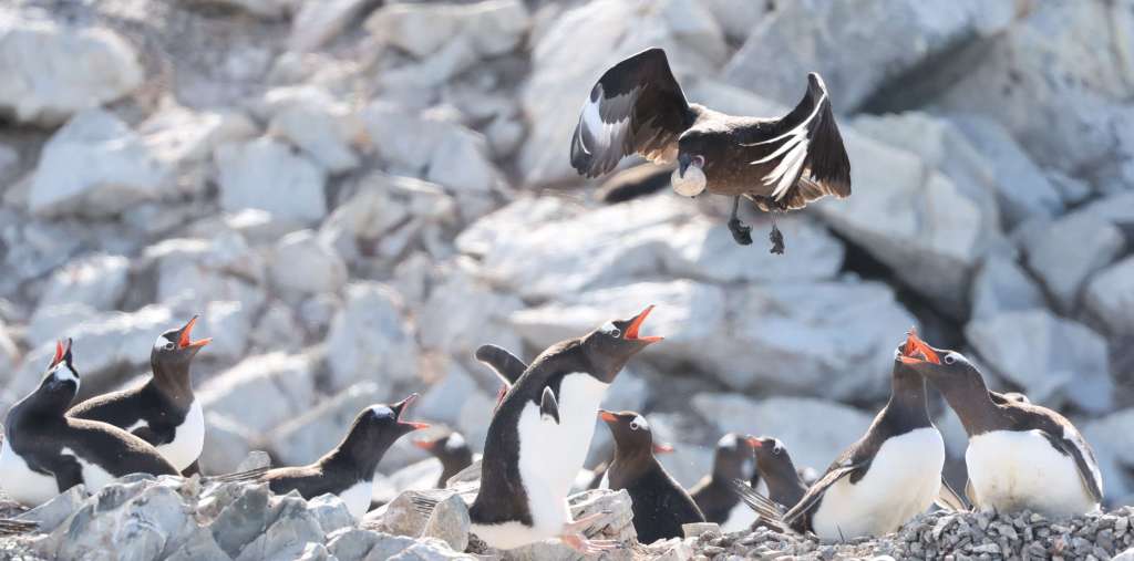 Brown Skuas, Southern Giant-Petrels and Kelp Gulls were regulars at the penguin colonies.