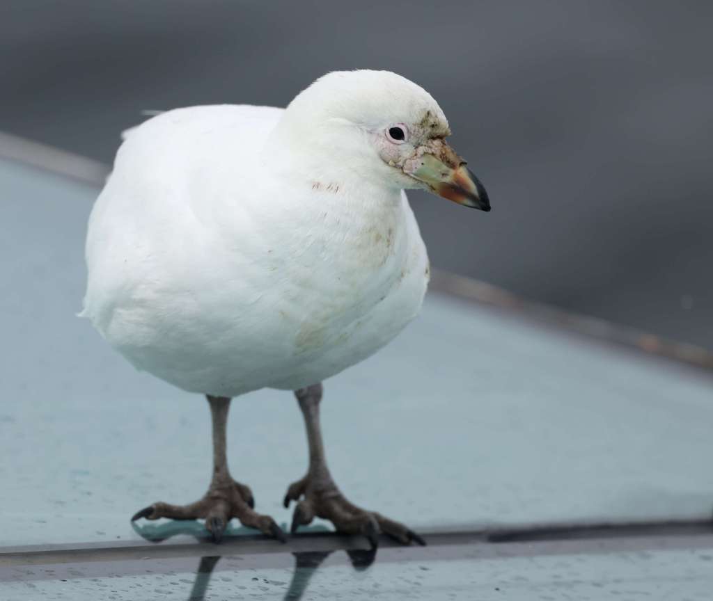 I had read about the strange Snowy Sheathbill beforehand and wondered if we would see any of these birds. Sure enough, their entrance was suitably weird: a group of them landed on the glass roof of the ship’s top deck, so I first saw them from underneath!